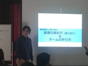後半は、グループとチームの違いをしっかり認識するために、チームビルディングを行いました。実際の講義では、チームが機能するために設定、心理的安全性、コミュニケーションにフォーカスし、どういうところに意識することが大事なのか事例をあげていました。ファシリテーターの吉岡氏が職場で実践している朝会とう取り組みの紹介がありました。