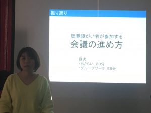 今回初めて参加された方は、会議での悩みを共有したうえで、聴覚障害者が会議に参加するためにはどのような工夫をすれば良いかを話し合いました。その際に、聴覚障害者の大きな悩みとして、情報が共有されていない面をしっかり見つめ、実際のワークではより共有していこうという雰囲気が表れていました。