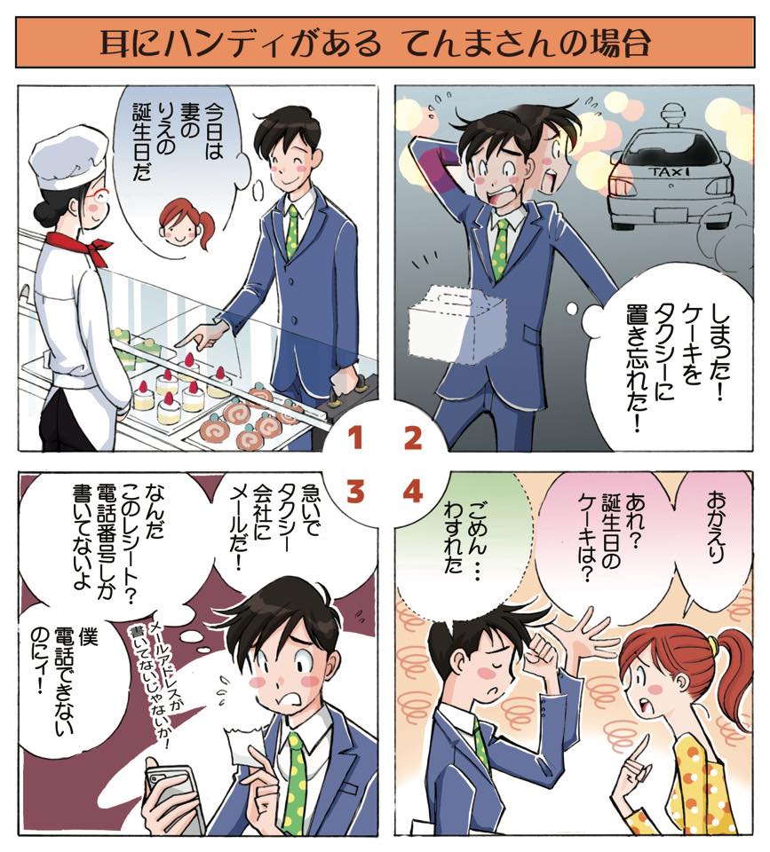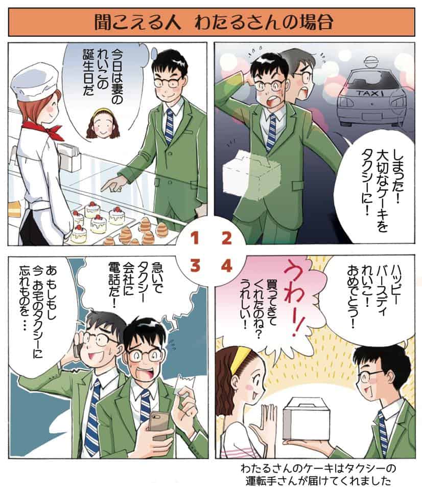 聞こえる人と聞こえない人では、以下のマンガのように妻のバースデーケーキをタクシーに忘れた場合、対応に差がでてくることはしょっちゅうあります。