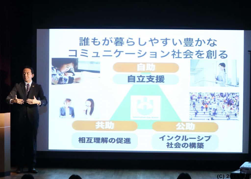 IGBの伊藤理事長はコミュニケーションバリアの解消をする為に、当事者のスキルアップする自助だけではなく、社会がお互いを助け合う共助、国が支援する公助の3本柱で進める事が大事であることを伝えている。