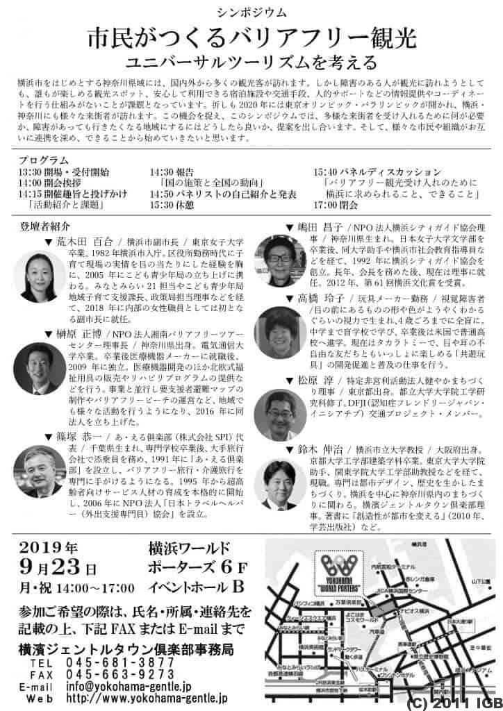 NPO法人インフォメーションギャップバスターが協力団体として参画しているシンポジウム「市民がつくるバリアフリー観光 ~ユニバーサルツーリズムを考える~」(9/23(月・祝)開催)を紹介いたします。手話通訳が付いていますので是非ともご参加ください。