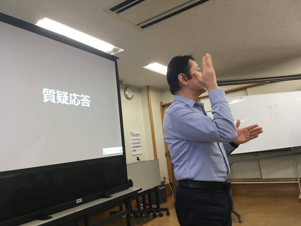 東京都稲城市聴覚障害者協会の荒川健一会長とIGBの伊藤芳浩理事長の説明を、皆さんメモを取りながら真剣な眼差しで聞き入っており、質疑応答では様々な角度からの質問が数多く寄せられました。
