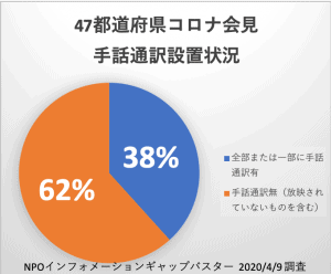 - 政府や各都道府県において行われる全ての会見に、手話通訳および文字通訳 (字幕)をつけていただくようにお願いいたします。NPOインフォメーションギャップバスターの調査では、都道府県の約6割が手話通訳がついていないことが判明しています。