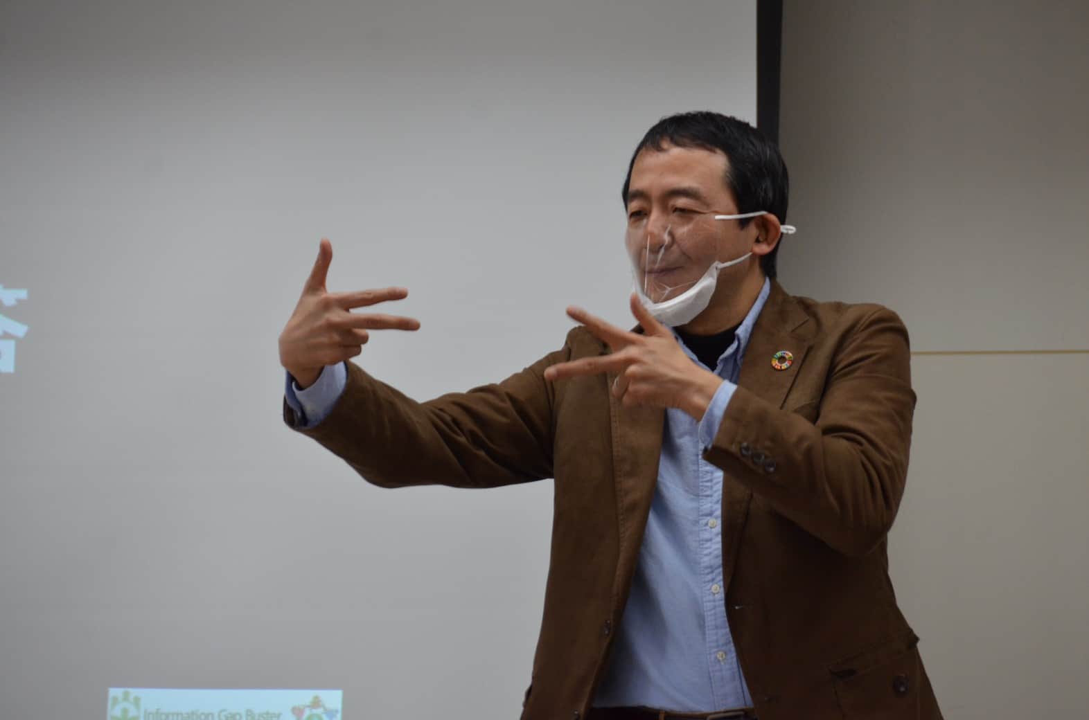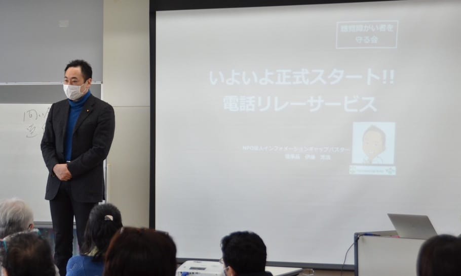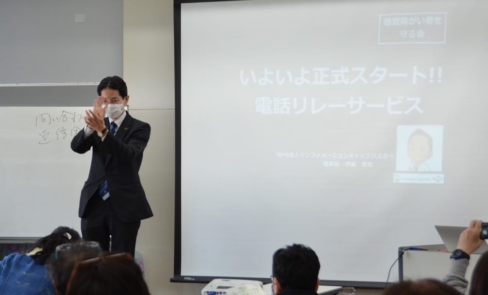 本講演会は、NPO法人インフォメーションギャップバスターの伊藤 芳浩理事長が講師として、電話リレーサービスの概要、これまでの正式サービス化の取り組み、正式サービス化の際の変更点などをお話ししました。
