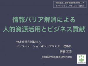 1/24に、一般社団法人 経営倫理実践研究センター ダイバーシティ・マネジメント研究会に講師として、「情報バリア解消による人的資源活用とビジネス貢献」というテーマにて人事・CSR・ダイバーシティ担当者の前にてお話しさせていただきました。一般企業の方を対象にした講演なので、顧客や従業員対応の心構えを中心にお話しさせていただきました。