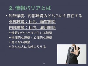 この場で、情報バリア解消の手段の例として、UDトーク(音声認識アプリ)や電話リレーサービスについて紹介しました。この他、職場での配慮すべきことや支援制度についてなど、知って欲しいことを説明しました。