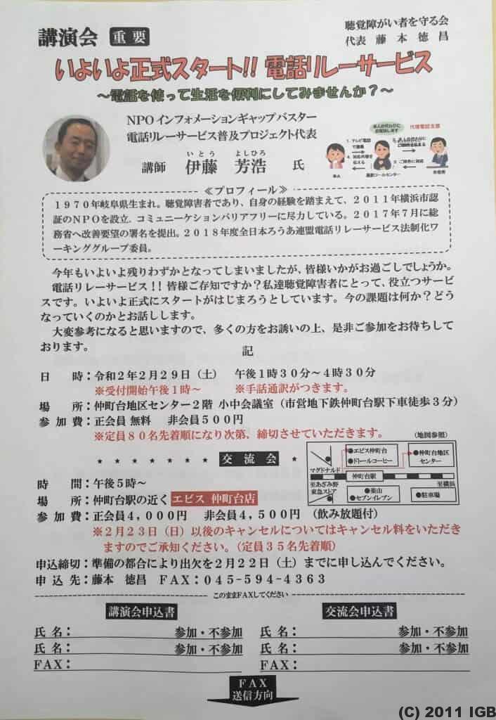 2020年2月29日(土)に聴覚障がい者を守る会(横浜市都筑区)主催のイベントにて、「いよいよ正式スタート電話リレーサービス」というテーマにて講演いたします。関心があれば是非ともご参加ください。